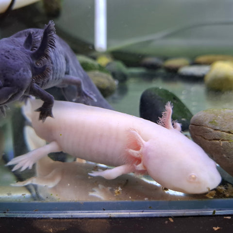 We recommend getting Nightcrawlers to feem your Axles. Feed about one medium worm a day, but keep an eye on their tummy. If they are getting too fat then slow down your feeding a bit, and if they are getting quite thin then make sure to feed them more.