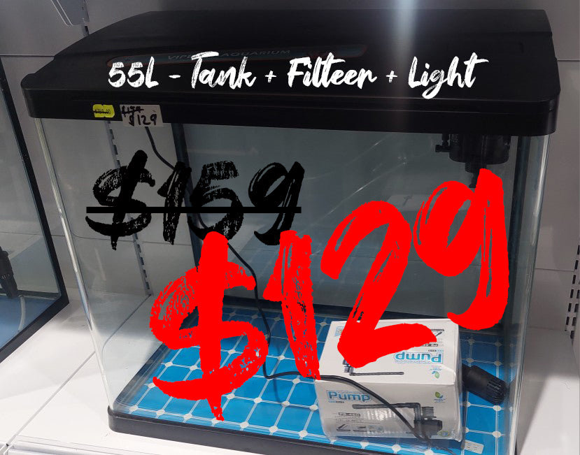 This is a 55L tank (49cm x 28cm x 45cm) perfect for shrimp, snails or small fish. It comes with a light, and fully functioning filter in the lid.