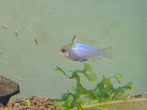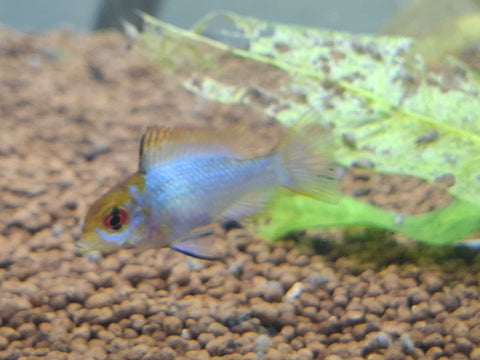 The Electric Blue Ram, being a selectively bred and farm-raised species, is accustomed to consuming commercially processed flake and pellet foods. They are generally considered aggressive feeders, eagerly swimming to the aquarium glass in anticipation of feeding when approached by the hobbyist.