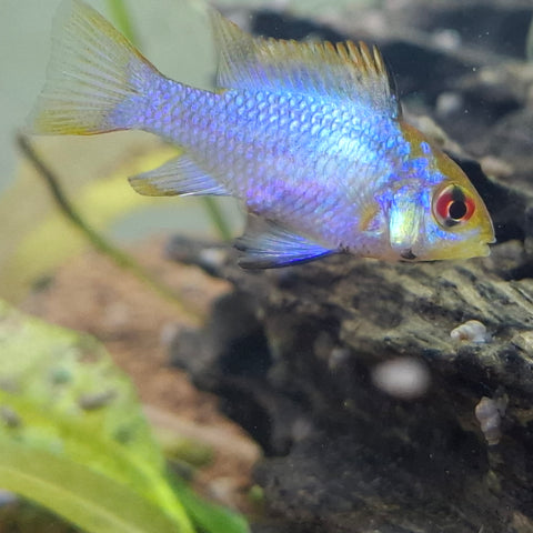 The Neon Blue Ram is a selectively bred variant derived from the German Blue Ram, itself a color variant of the original wild Ram.