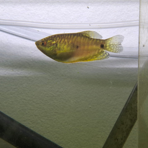 This stunning variant of the Three Spot Gourami (Trichopodus trichopterus), previously known as Trichogaster trichopterus, boasts an attractive golden hue with distinctive striped patterning along its back, though it lacks the two dark spots characteristic of its parentage. Renowned for its vibrant coloration, the Gold Gourami adds a captivating allure to any aquarium setting. In its natural habitat, Three Spot Gouramis inhabit various lowland wetlands, including marshes, swamps, and peatlands, as well as flowing streams and canals, favoring shallow, vegetated waters. Omnivorous by nature, they consume a diet comprising crustaceans, insect larvae, and zooplankton.
