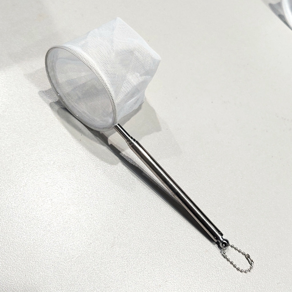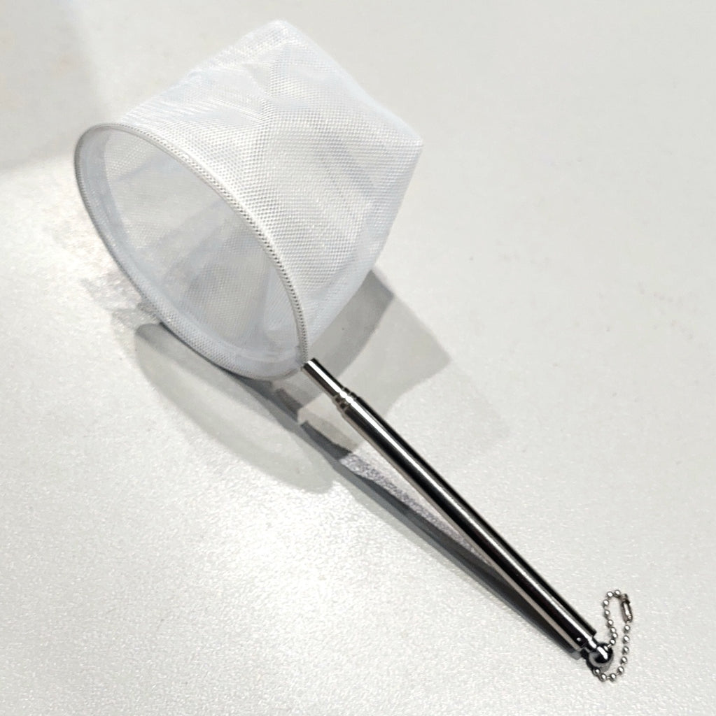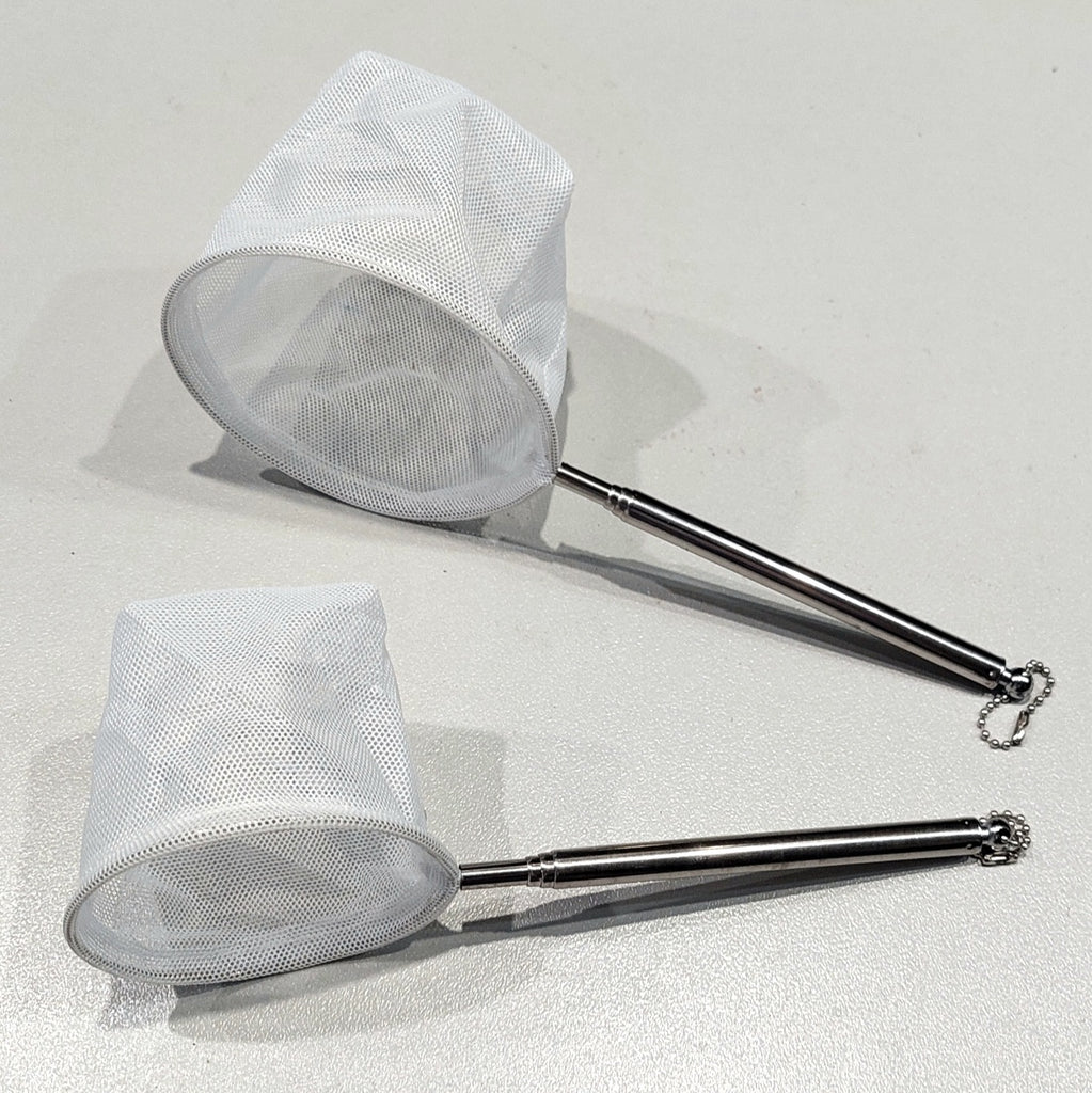 This is a fairly stiff white stainless steel net for shrimp and small fish. The handle stretches out and back in easily but firmly. This net is particularly easy to catch shrimp in and what we use to catch and sort our shrimp due to the rigid net structure.