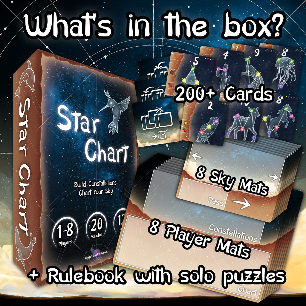 Star Chart can be played solo just as a puzzle to solve, with different cards every time, or it can be played with up to 8 players! Each game takes about 15 minutes, even for 8 players since turns are simultanious.